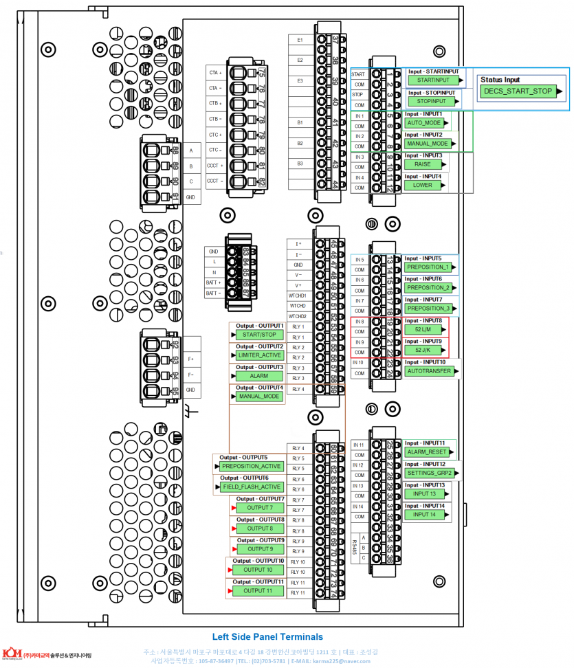 Default Logic 에 따른 DECS-250 Inputs and outputs(I/O) 단자대 위치입니다.